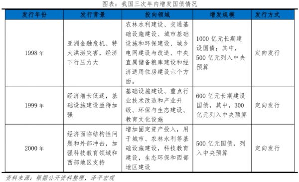 历史上我国仅有三次年内增发国债,分别是1998、1999与2000年,分别增发1000亿、600亿、500亿,主要用于基础设施建设,涉及农林水利、交通电网、产业升级、科教建设等。2006年以后对国债实行余额管理,在国债限额内可超发。