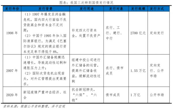 特别国债是为特定目标发行的,具有明确用途的国债,具有专款专用、用途灵活的特点,我国发行特别国债的时间为1998、2007和2020年。其中,1998年的特别国债用于亚洲金融危机之下的四大行资本金补充;2007年的特别国债用于提高外储收益、缓解流动性过剩压力,2020年则用于“抗疫”。2017年10月的6000亿特别国债是续作2007年。