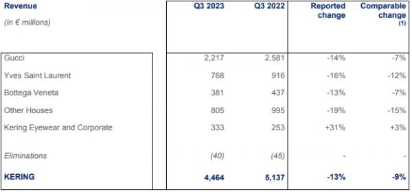 据时尚商业快讯,在截至9月30日的第三季度,开云集团销售额按固定汇率计算下跌9%至44.64亿欧元,按即时汇率计算大跌13%,远不及分析师预期,为疫情恢复后首次下跌。前三季度,该集团销售额同比下跌2%至145.99亿欧元。