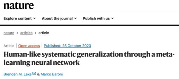 2023年10月25日,纽约大学的Brenden Lake和西班牙加泰罗尼亚研究所的Marco Baroni在国际顶尖学术期刊Nature上发表了题为:Human-like systematic generalization through a meta-learning neural network的研究论文。