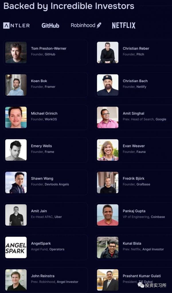 这个产品叫 Dimension,其投资人里包括了一大堆公司的创始人,比方说 Pitch 的创始人 Christian Reber、GitGub 联合创始人 Tom Preston-Werner、Framer 创始人 Koen Bok、Netlify 创始人 Christian Bach、WorkOS 创始人 Michael Grinich 以及前 Google 搜索负责人 Amit Singhal 等(如下图)。