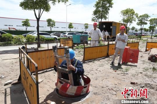 国家电网上海电力工作人员在特斯拉上海工厂外下井作业。 张亨伟 摄