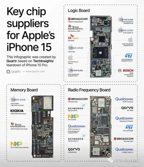 本文将以iPhone 15 Pro为例,重点分析苹果的主要芯片供应商。(因为iPhone 15 配备了 A16 Bionic 芯片,而只有 iPhone 15 Pro 和 15 Pro Max 使用了先进的3纳米 A17 Pro 芯片。)根据Quartr基于Techinsights的拆解报告的一份绘图,可以清晰地看到iphone 15 pro的不同芯片供应商。