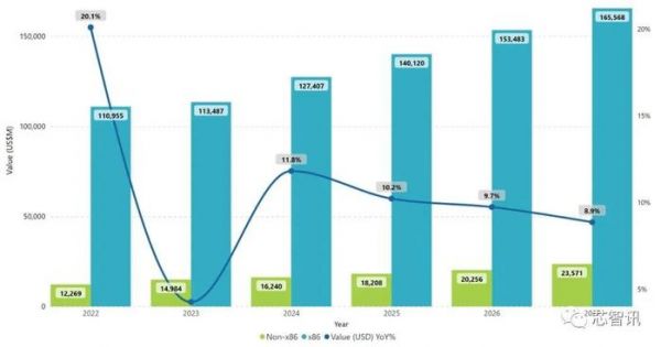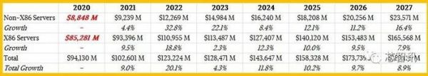 从整体的趋势来看,未来数年内,虽然非x86服务器保持了持续的高速增长,但是x86服务器仍然是整个服务器市场的主流,以销售计算的占比将持续维持在87.5%以上。即使到2027年,非x86服务器的市场份额仍然只有不到12.5%,相比2023年的11.66%,仅增长了1个百分点不到。