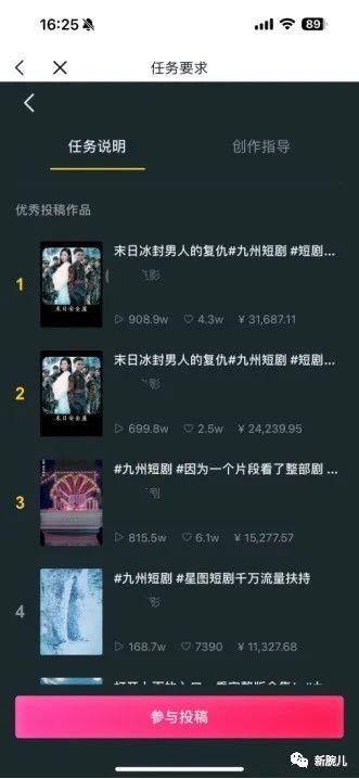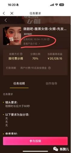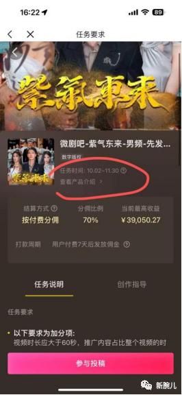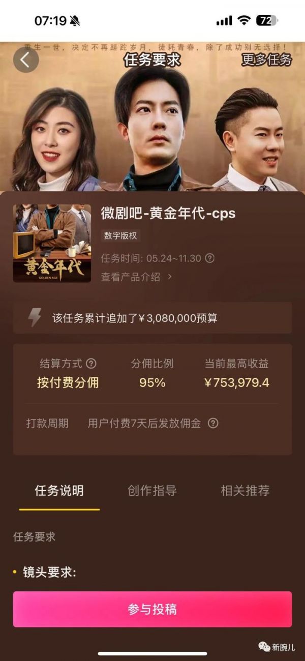这部短剧推广的任务要求:视频时长应大于60秒,需推广内容占整个视频时长不低于100%。必须与推广的内容相关,发布内容必须进行二次创作,不得涉及推广影视无关画面。