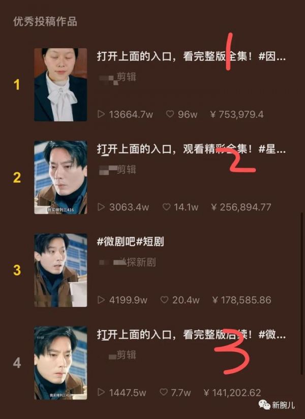 更令人吃惊的是,这部剧分销投稿的4条视频中,D哥剪辑成功上榜3条,总收益达到115万元。