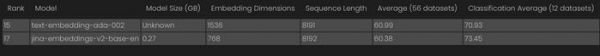 与 OpenAI 的 8K 模型 text-embedding-ada-002 进行比较,jina-embedding-v2 在分类平均值、重排平均值、检索平均值和摘要平均值方面均优于 OpenAI 的 text-embedding-ada-002。
