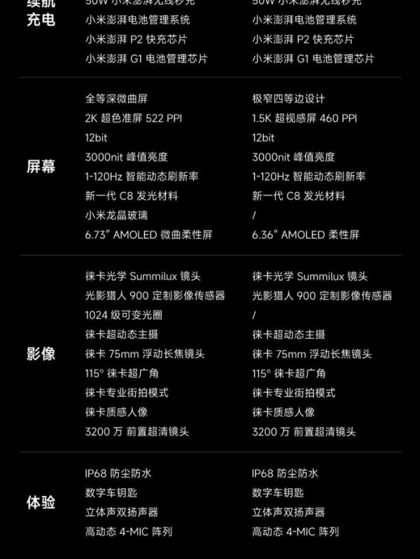 显示方面,该机采用了 6.73 英寸 OLED 等深四曲屏,应用华星 C8 发光材料,局部峰值亮度可达 3000nit,还有 3200×1440 分辨率、12bit 色深、1−120Hz LTPO 无级高刷,支持类 DC 调光和 1920Hz 高频 PWM 调光,并且首发小米龙晶玻璃盖板。