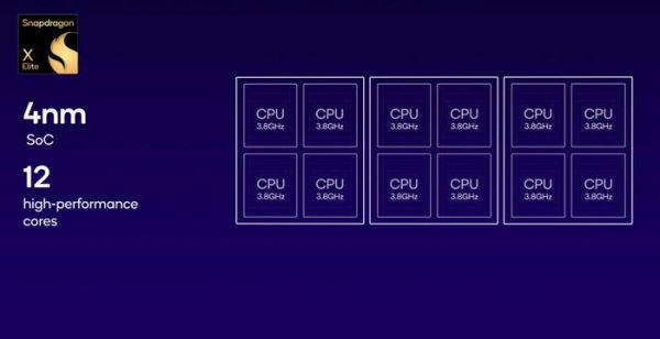 另一方面,作为一款 4nm 芯片,骁龙 X Elite 也使用了全新的架构设计,配备 12 个 3.8GHz 高性能核心,采用三丛集设计。