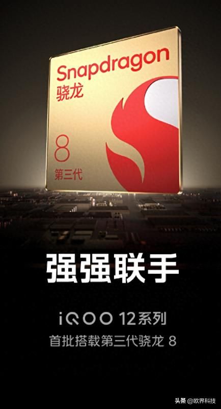 欧界科技10月25日消息:随着骁龙8 Gen 3移动平台的正式亮相,搭载该芯片的机型也开始陆续进行预热;今日iQOO官宣,iQOO 12系列手机将首批搭载第三代骁龙8移动平台,宣传语为“强强联手,比强更强”。其在微博投放的广告显示,iQOO 12系列手机新品发布会将于11月7日19:00举行。