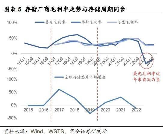 进一步看,首先厂商的毛利率走势一般与存储周期同步。今年一季度至二季度,美光、华邦、旺宏等存储厂商的毛利率已经来到最低位置,美光毛利率更是打破了近年来的历史新低,首次达到负数。