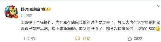 由于存储涨价,大存储手机可能也要暂时告别“白菜价”,以爆料准确著称的博主“数码闲聊站”表示,接下来的部分新款旗舰机型起售价预估会上浮300~500元。
