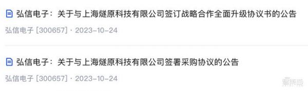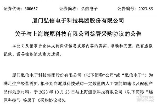 10月24日晚间,厦门弘信电子科技集团股份有限公司(简称“弘信电子” )发布《关于与上海燧原科技有限公司签署采购协议的公告》、《关于与上海燧原科技有限公司签订战略合作全面升级协议书的公告》。