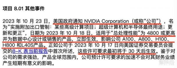 而就在当地时间10月23日,英伟达提交公告称,美国政府通知其对华出口高性能AI芯片的限制“立即生效”,将影响A100、A800、H100、H800、L40S等芯片产品。