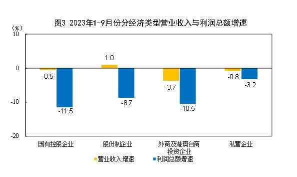 1~9月份,规模以上工业企业中,国有控股企业实现利润总额18477.0亿元,同比下降11.5%;股份制企业实现利润总额39623.7亿元,下降8.7%;外商及港澳台商投资企业实现利润总额12878.1亿元,下降10.5%;私营企业实现利润总额14385.0亿元,下降3.2%。9月份,规模以上工业企业实现利润同比增长11.9%。