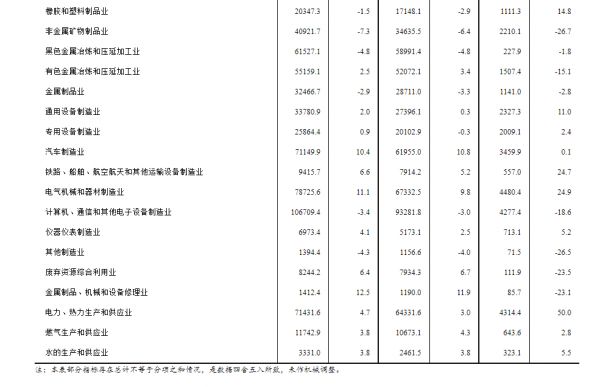 1~9月份,主要行业利润情况如下:电力、热力生产和供应业利润总额同比增长50.0%,电气机械和器材制造业增长24.9%,通用设备制造业增长11.0%,专用设备制造业增长2.4%,汽车制造业增长0.1%,黑色金属冶炼和压延加工业下降1.8%,石油和天然气开采业下降9.4%,纺织业下降10.2%,农副食品加工业下降15.1%,有色金属冶炼和压延加工业下降15.1%,计算机、通信和其他电子设备制造业下降18.6%,煤炭开采和洗选业下降26.5%,非金属矿物制品业下降26.7%,石油、煤炭及其他燃料加工业下降40.4%,化学原料和化学制品制造业下降46.5%。