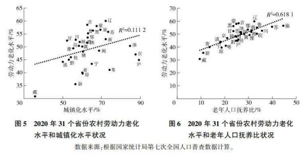 其二, 2020年农村老年人口抚养比为28.13%,分别高于全国和城镇8.4个、12.6个百分点;2030年农村老年人口抚养比将高达63%,比城镇老年人口抚养比高出25%。未来乡村人口年龄结构将严重“瘦身”,形成两头大、中间小的“窈窕”结构(孟向京,姜凯迪,2018)。图6再次印证了农村人口老龄化之于劳动力年龄结构老化的作用,31省的农村劳动力老化水平与老年人口抚养比的相关系数达0.62,反映了二者具有较高的线性关系紧密程度。
