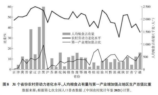其次,在农村劳动力老化水平超出全国均值的18个省份中,有14个省份的粮食人均产量超过了400公斤这一粮食安全线。由此可见,当前在农村劳动力老化势头发展迅猛的省份,整体并未出现严峻的区域性粮食安全问题,这在一定程度上反映了劳动力老龄化对区域性粮食安全的影响仍较为有限。