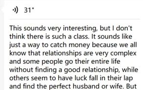 在他看来,感情是个复杂的东西,有些人穷其一生也找不到心仪的另一半,怎么可能通过上这样的课就找到完美伴侣了呢?