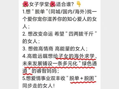 但此类“女子学堂”真的能像他们宣传的那样,帮助女性提升,传播优秀的中华文化吗?离异的单身女性就只能选择这样一条道路来换取下半生的幸福吗?
