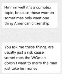 30多岁的Bailey来自美国科罗拉多州,对于这样的课程他给出了更加犀利,甚至有点极端的点评。在他看来,参加这种课程的女子目的都不单纯,不是为了骗钱就是为了拿到美国身份。