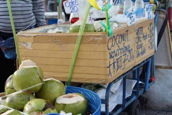 在泰国大皇宫附近买了颗冰镇椰子,约合人民币6元钱。摊主是位六十多岁的奶奶,不大的摊位前悬挂了抽纸巾,准备了塑料凳,全程戴手套操作。