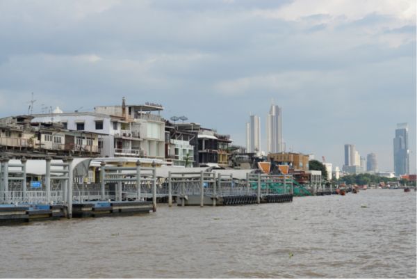 在湄南河上望向沿岸,近处是低矮陈旧的自建房,远处是高耸的现代化大楼,虽不一致但也和谐,旧和破败无关。