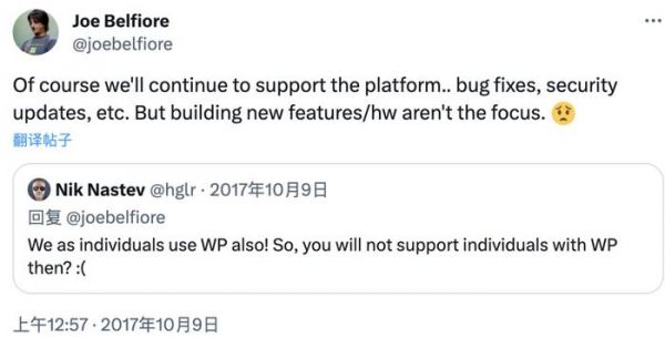 于是,微软开始把软件开发和与 Android 和 iOS 的整合放在首位,并在 2017 年,微软时任操作系统部门副总裁 Joe Belfiore 发推文表示,“关于 Windows Phone,我们已经尽力了。当然,我们仍会维护这个平台以及更新安全补丁。只是我们不会再推出有关 Windows Phone 的新硬件或者功能了。”