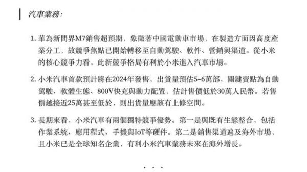 天风国际证券分析师郭明錤也表示,这款车的关键卖点在于自动驾驶技术、软件生态系统、800V快速充电以及动力配置。据悉,小米汽车将采用高通的车机芯片组,很可能是高通骁龙8295。这款芯片组已经在百度和吉利合资的极越01车型上得到应用,而新车还将支持苹果CarPlay互联,使用户能够无缝连接他们的苹果设备。