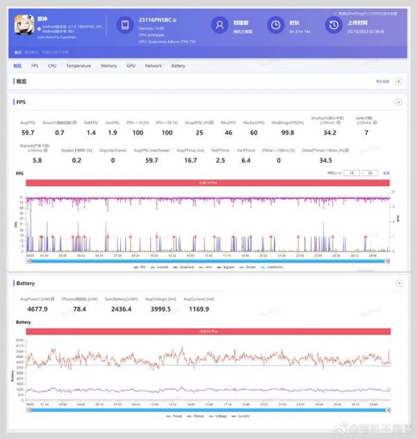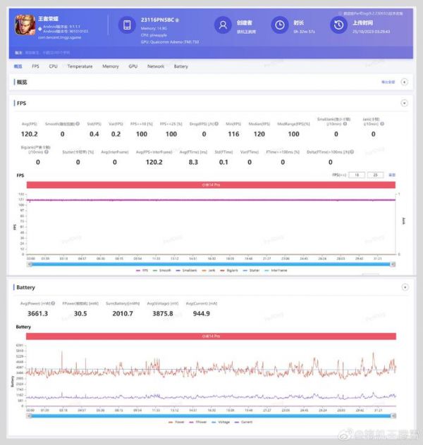 游戏方面,室温22℃左右,极高帧率 + 极致画质模式双开半小时《王者荣耀》平均帧率120.2帧、平均功耗3.7W、最高温度38℃;最高画质半小时《原神》,一路跑图 + 打怪,平均帧率59.7帧、平均功耗4.7W、最高温度42.2℃。这数据就比较厉害了,和上代骁龙8 Gen2相比,功耗表现出色,并且温控也更好了,整体帧率曲线比较平稳,骁龙8 Gen3稳了。