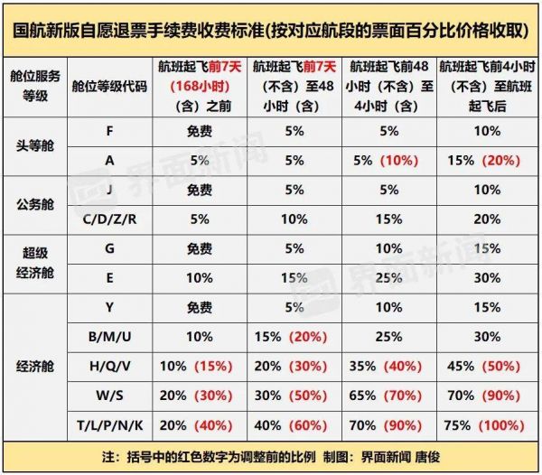 国航经济舱的W/S舱位,退票费率最高也降低了20个百分点;H/Q/V舱位退票费率最高降低了10个百分点。
