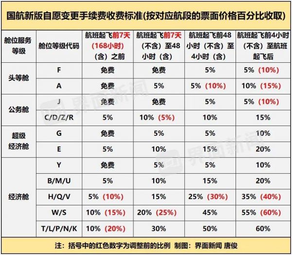 不过,与现行的退改收费标准相比,国航新版退改收费标准确实有较大幅度降低。以票面价格为基准,经济舱各舱位退改手续费降低了5%~25%。