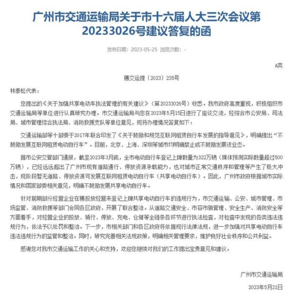 广州市交通运输局关于市十六届人大三次会议第20233026号建议答复的函诚然,共享电单车能够满足市民中短途的出行,也符合低碳出行的趋势,但也要看到,共享电单车的野蛮生长、无序发展,也给城市的管理造成困扰。