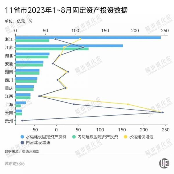 为此,沿江各省份近年动作频频,从治理生态到整合港口、修建运河,持续加码内河航运。仅今年1~8月,11省市在水运建设上的固定资产投资就达690.7亿元,其中内河建设投资达到433.3亿元,分别占全国相应投资额的54.7%、66.5%。