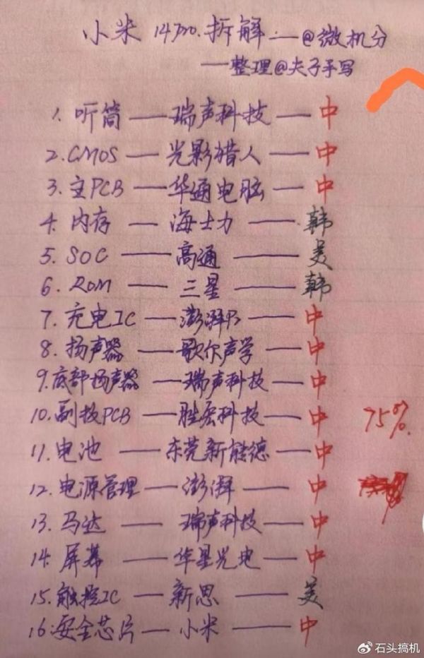 根据拆机视频,有网友统计了小米14 Pro各个零部件厂商,其中除了性能三大件以外和屏幕的触控IC,其与的零部件全部来自中国的供应链厂商,当然还包括了小米自家的充电芯片、电源管理芯片、光影猎人主摄。另外,小米14 Pro的屏幕玻璃盖板也是小米自研的龙晶玻璃,系统也是自研的澎湃OS,所以远不止75%。