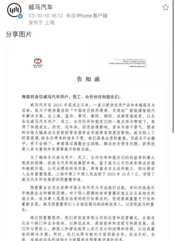2023年10月10日,威马汽车官方微博发布公告,宣布威马正式提交了预重整申请,表示希望通过这一途径“有针对性地尽早挽救企业和解脱困境”,并表示威马不会躺平,更不会倒下。