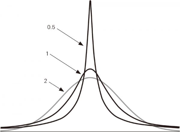 图 2:两种厚尾分布(黑色)和正态分布(灰色)的比较。这三种都是“稳定分布”,它们涉及一个参数,其值分别为 0.5、1 和 2