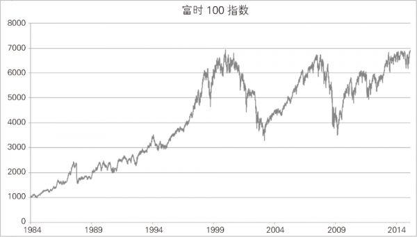 所有阅读报纸财经版面或在网上关注股市的人,都会很快发现股票的量价会以一种不规则、不可预测的方式发生变化。图 1 显示了富时 100 指数(英国股市 100 强公司的综合价格)在 1984 年至 2014 年的变化。它看起来更像是随机漫步而非光滑曲线。