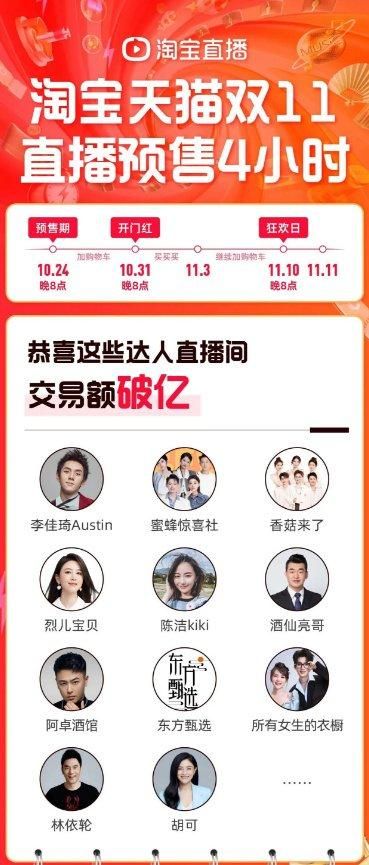 而另一边的淘宝直播,24日预售首日仅用4小时,就有李佳琦、蜜蜂惊喜社、香菇来了、烈儿宝贝、陈洁kiki、酒仙亮哥、阿卓酒馆、东方甄选、所有女生的衣橱、林依轮、胡可、FILA官方旗舰店等12个直播间率先破亿。其中甚至还有刚刚“出抖入淘”的东方甄选。