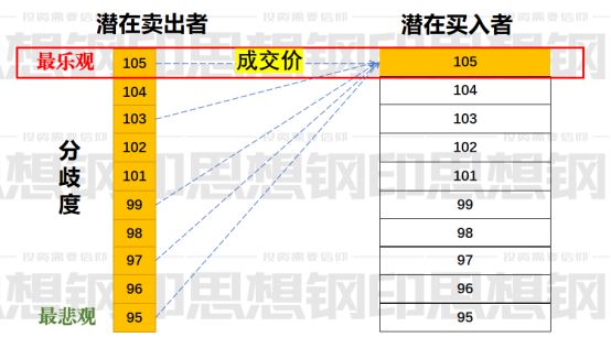 通常不是,原因在于潜在买入者和潜在卖出者的数量不对等,所有投资者都可以买入,但在无法“裸卖空”的市场,只有持有者才可以卖出,数量远远小于前者。假设这个股票非常热门,有意买入者是有意卖出者人数的10倍,所有卖家的数量加起来,等于出最高价的买入者的数量,那成交价就是最高的105。