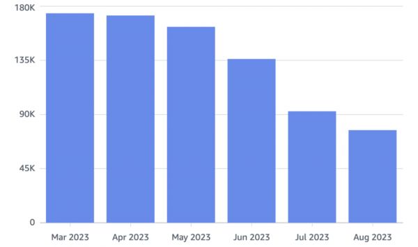 我们的云支出(不包括S3)已经减少了 60% 。从每月大约十八万美元($180,000)减少到不到八万美元($80,000)。每年可以在这里省下的钱折合一百万美元,而且我们在九月还会有第二轮大幅降低,剩余的支出将在年底前逐渐减少。