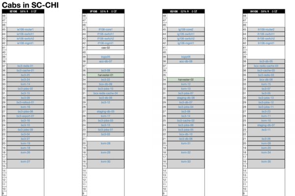 这是我们在芝加哥数据中心四个机柜的示意图(我们在 Ashburn 还有另外四个)。正如你所见,还有一堆专门给 Basecamp 用的老硬件。一旦我们装好新机器,大部分老服务器就该退役了。在下面带有 “kvm” 标记的2U服务器是新家伙: