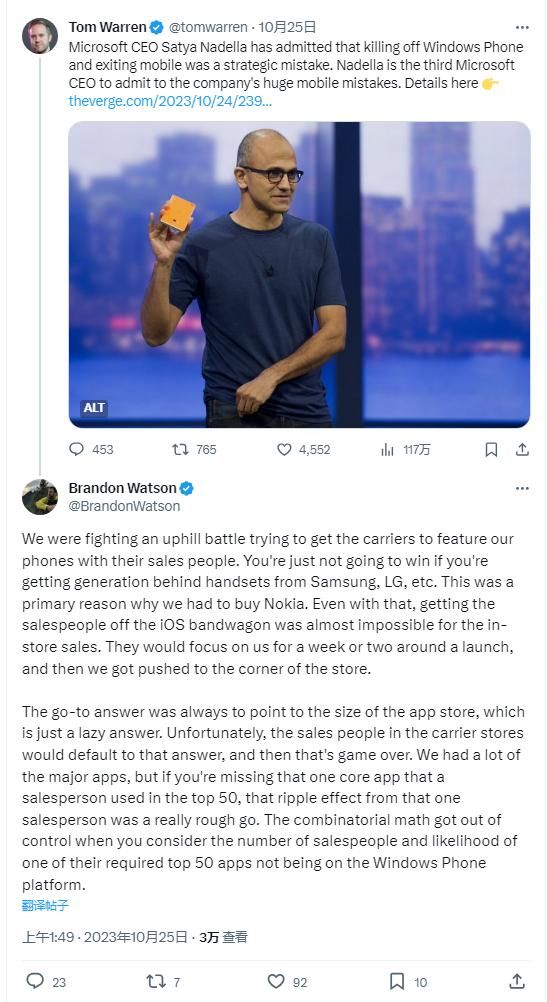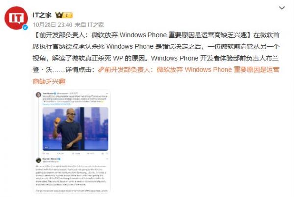 微软CEO称放弃Windows Phone是错误决定,前高管称是运营商缺乏兴趣