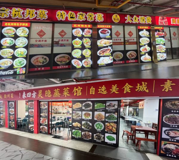 这里有一些餐饮店,是明显服务于游客和旅游团的。比如聚百福、来四方的主打杭帮菜的自选美食城,但显然不太能吸引那些寻求新鲜体验的“年轻人”。主干道上有一家“过气网红”竹筒奶茶,产品有“竹筒奶茶”和“抱抱竹奶茶”,但是鲜少有人埋单。