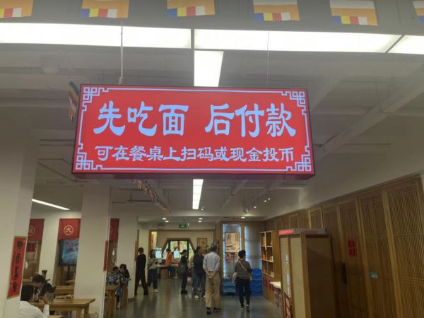 “龙华素斋”在上海龙华寺的最深处。这家店被大众点评收录了18年,也登上了2023年的必吃榜。龙华寺的素面的售卖方式,已经是时下鲜见的“先吃面、后付款”。香客扫桌面上的二维码字支付,全程无人监督,突出一个信任。