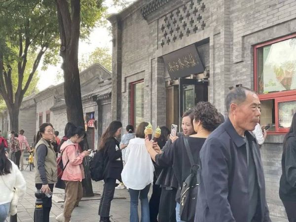 雍和宫周边出现了更多容易受到年轻人欢迎的品类,尤其是方便打卡拍照的。年轻人带动起了老字号翻红,吴裕泰茶庄9块钱一支的冰淇淋已经成为雍和宫打卡必备。临近停止入园的时间,队伍还能排到马路上。此外,梅潭村、三元梅园的中式甜品也颇受欢迎。
