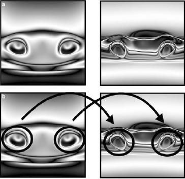 我们还可以提供一个更具体的案例。肯选择了以前用户培育的酷似外星人脸的图片作为亲代,并在此基础上进行了支化操作。肯一开始的计划是,培育更多外星人脸的图片,但接下来发生的事情却出人意料——在图片孵化器网站上的所有重大发现,在最终出现之前,几乎都充满了偶然性。随机的突变使外星人的眼睛,在几次迭代之后逐渐下调了位置,乍一看就像是汽车的车轮(见图 4)!这就是偶然性!谁能想到,一张外星人脸的图片,最终能演变为一张汽车的图片呢?但事实证明,前者的确是后者的踏脚石。