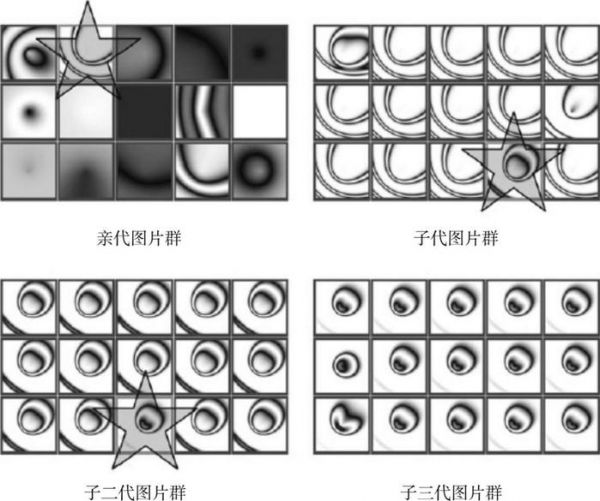 图 1:亲代和子代图片群示例注:在这个图片“繁育”的简单示例中,用户在“亲代”图片群中选择了一张类似正方形的图片,结果,下一代的图片(右图,“子代”图片群)就包含了不同类型的方形图片,因为每一张图片都是用户选择的方形图片的后代。