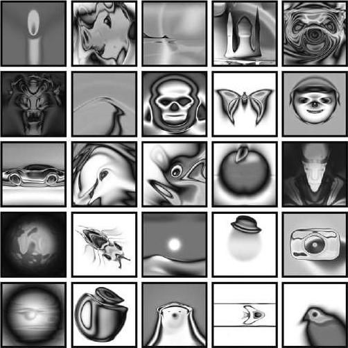 2006 年,我们开发了一种全新的人工图片 DNA,它能生成比以前更丰富、更有意义的图片(你将在下文看到)。更重要的是,这个全新的项目(也就是后来的图片孵化器网站)包含了使它变得尤为有趣的另一个因素,即任何一个互联网用户,都可以利用历史用户“繁育”的图片作为亲本,继续“繁育”下一代。这个功能对图片孵化器网站而言尤为重要,因为这种类型的系统的不足之处在于,用户可能玩了一小会儿之后,就会感到头昏眼花,不想继续了。毕竟,你能一口气盯着满屏的图片多长时间?事实证明,大多数玩家在“繁育”20 代图片(即连续选择 20 次图片)之后,就无法继续集中精力了。但是,只有经过多个代际的进化,才能取得最好的效果。这就意味着仅仅“繁育”20 次,很难产生真正有趣的图片。