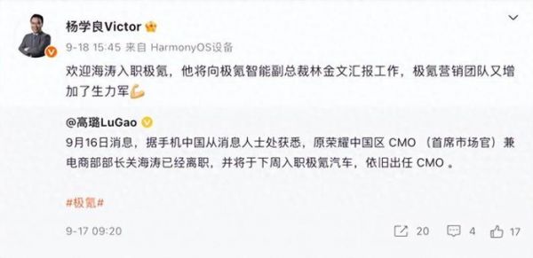 时下,机圈 " 攻入 " 车圈已经不再是个例,而是业已形成的趋势。除了主流手机厂商下场造车以外,机圈 " 大佬 "、名人、博主也纷纷向 " 车圈 " 迁徙。上个月,vivo 旗下子品牌 iQOO 产品经理宋紫薇确认已入职理想汽车的新闻冲上热搜,几乎就在同时吉利集团副总裁杨学良在社交媒体确认,前荣耀 CMO 关海涛加入极氪,负责市场推广和品牌建设。此前理想汽车的 CTO 谢炎、销售与服务高级副总裁邹良军、CFO 办公室负责人李文智也都出身华为。